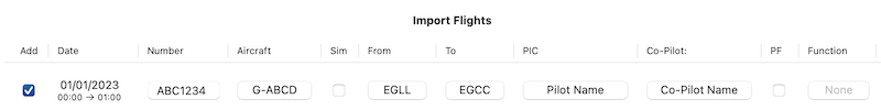 - For each flight you can modify the imported aircraft, departure and arrival airports, pilot names, and change the function time in which you operated the flight with the Function dropdown.